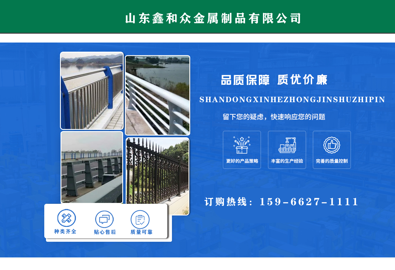 山東鑫和眾金屬制品有限公司主要產(chǎn)品有防撞護欄,橋梁護欄,道路護欄,河道護欄,不銹鋼護欄等護欄。提供設(shè)計方案,一站式定制,包您滿意價格優(yōu)惠,歡迎來電咨詢! 公司常年從事銷售護欄防撞護欄,橋梁護欄,道路護欄,河道護欄,不銹鋼護欄,橋梁鋼護欄,河道燈光護欄等。產(chǎn)品廣泛應(yīng)用于橋梁、河道、旅游景區(qū)、道路、公路、公園、小區(qū)、景觀、道路防撞等領(lǐng)域?! 」井a(chǎn)品均采用優(yōu)質(zhì)不銹鋼材料,符合相關(guān)標準。各種型號不銹鋼復合管及護欄,質(zhì)量嚴格把控。產(chǎn)品強度高、耐腐蝕、焊接牢固、抗沖擊、性能好,防撞護欄結(jié)構(gòu)簡單、美觀實用大方。 歡迎前來訂購!...